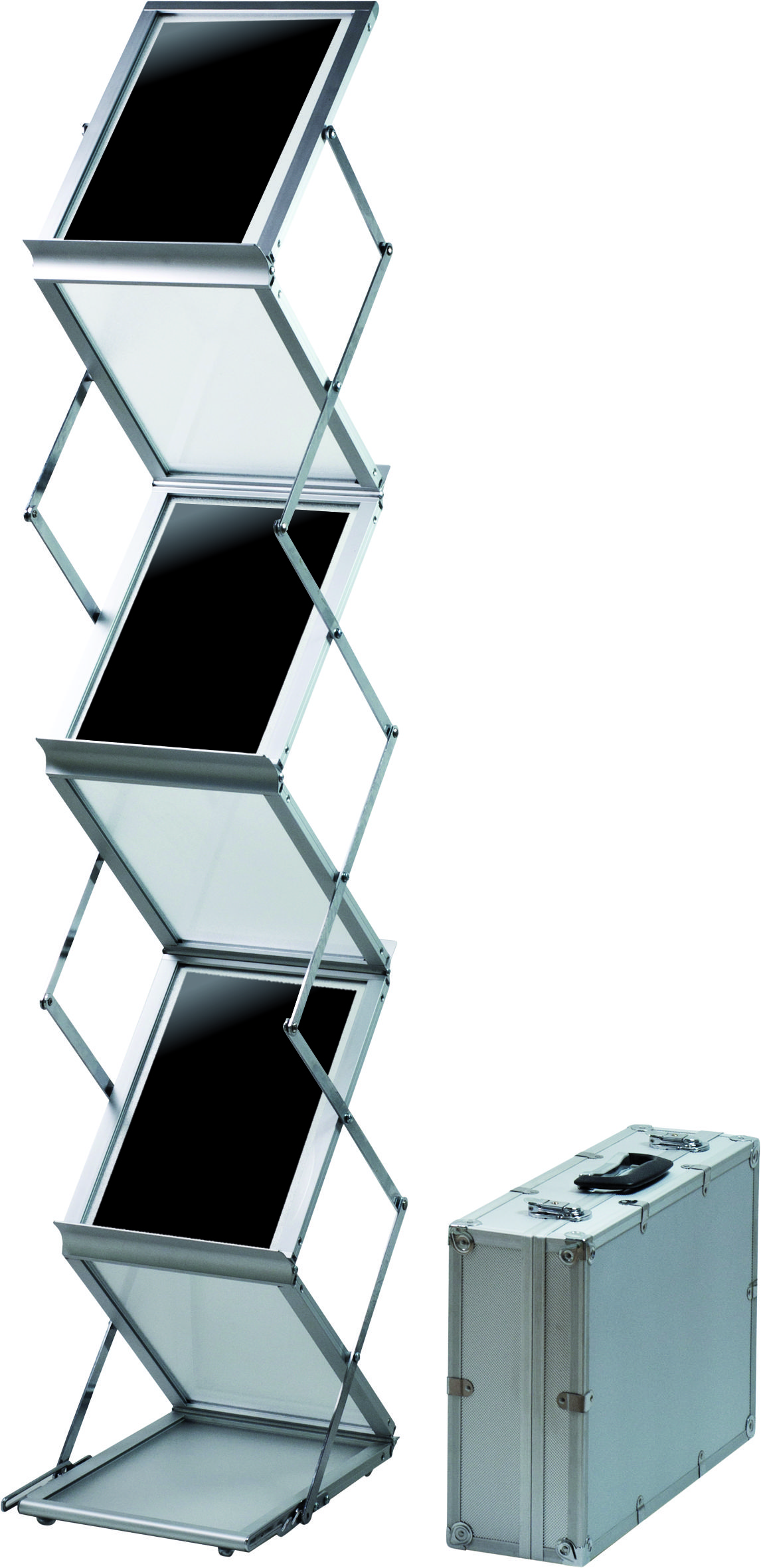 Collapsible brochure stand with 6 A4 shelves. Lightweight design in aluminium. Simple and quick to open and fold together. Supplied complete with aluminium case.