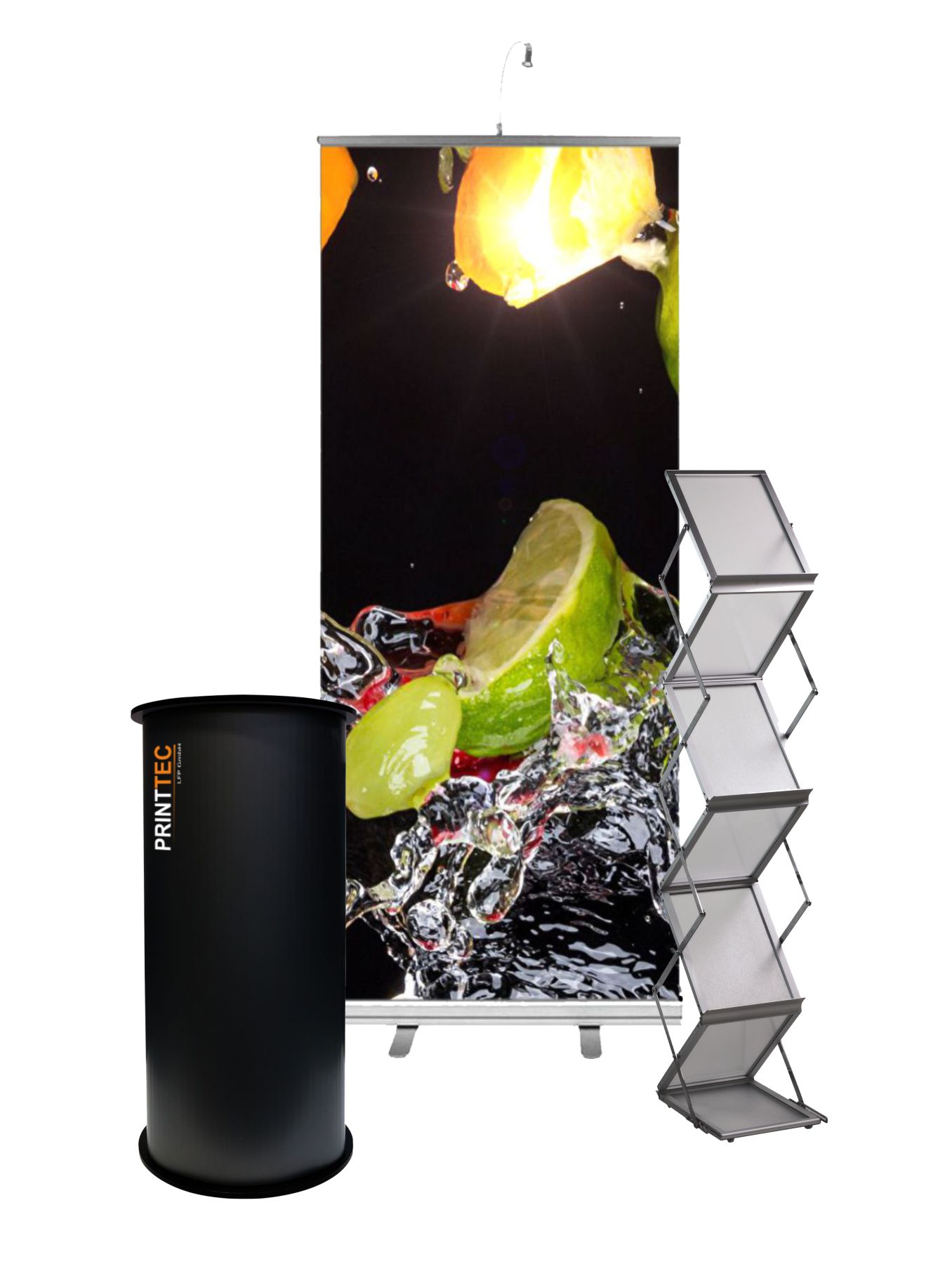 Exhibition stand PM 1 consisting of a trade fair counter, a Rollup Basic 85 x 200 cm (incl. lighting) and an A4 brochure holder.