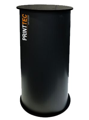 Round plastic trade fair counter in elegant design. Upper and lower plate in black/white - can be used from both sides. Incl. plastic panel for mounting of foil print. Incl. 2 carrier bags. Quick and easy to set up and carry.
