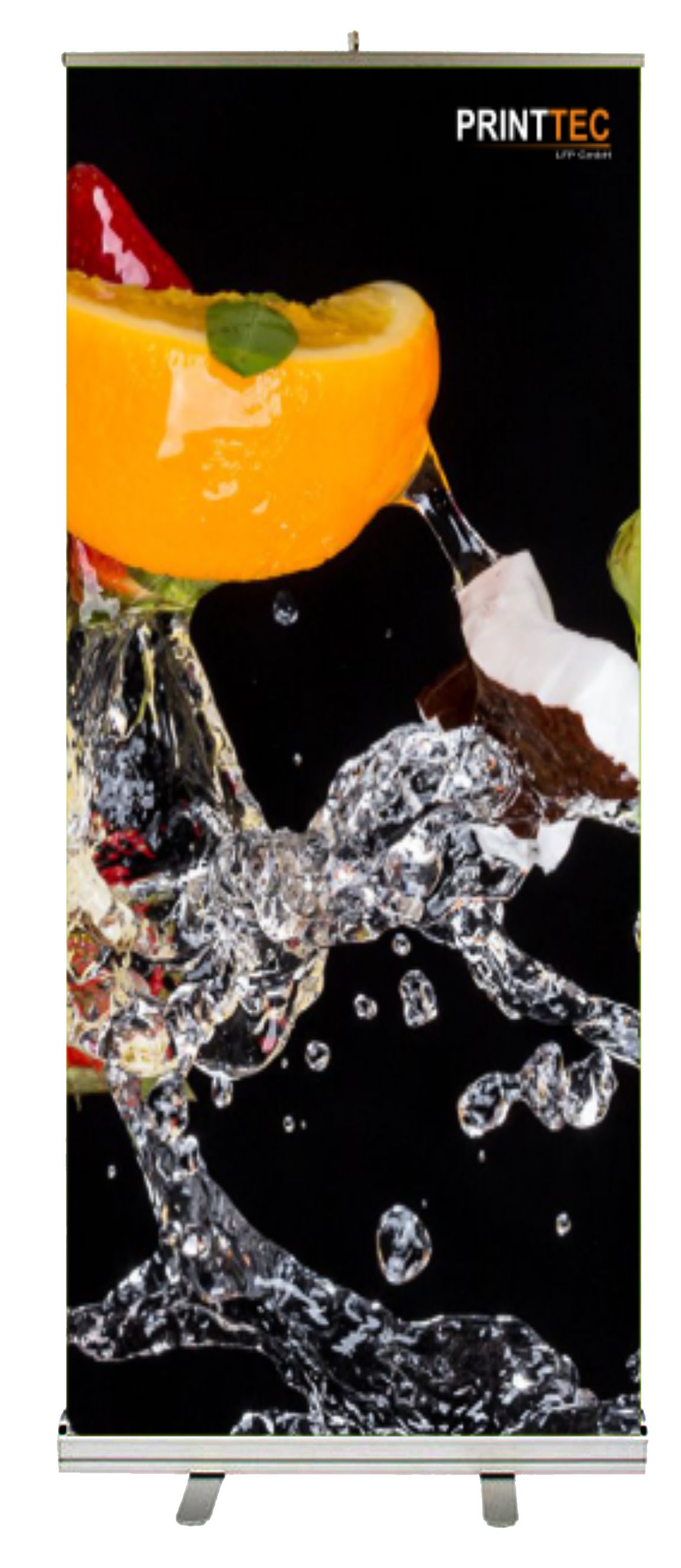 Roll-up on the inside made of silver anodised aluminium. Sturdy construction with 2 feet. Top clamping strip and adhesive tape on the roll allow easy mounting of the banner. When changing the banner new adhesive tape must be mounted. The delivery takes place incl. a black carrier bag. incl. banner.