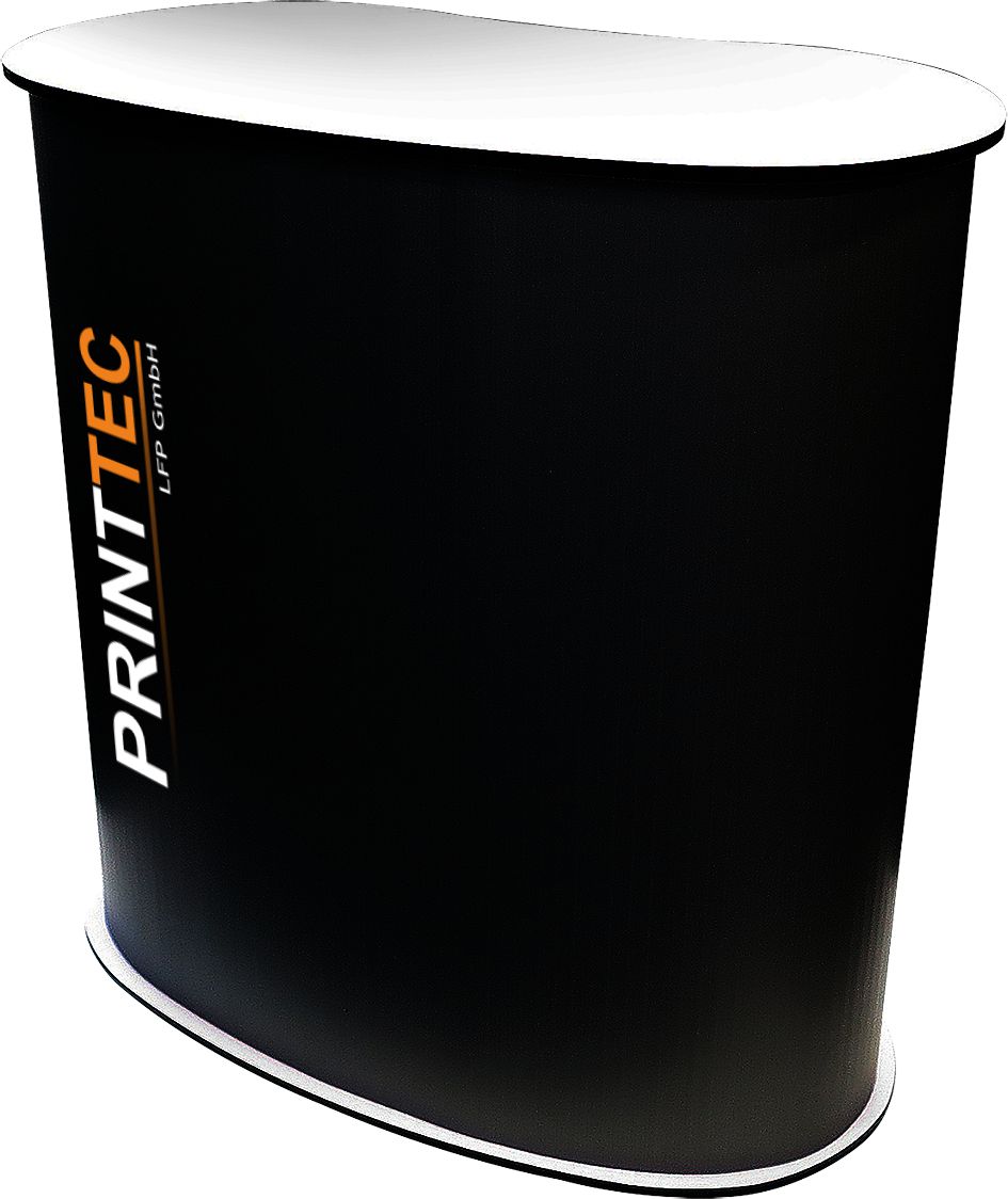 Trade fair counter made of plastic in an elegant design. Upper and lower plate in black/white - can be used from both sides. Incl. plastic panel - for mounting of foil print, intermediate shelf - and two carrier bags. Quick to set up and easy to carry.