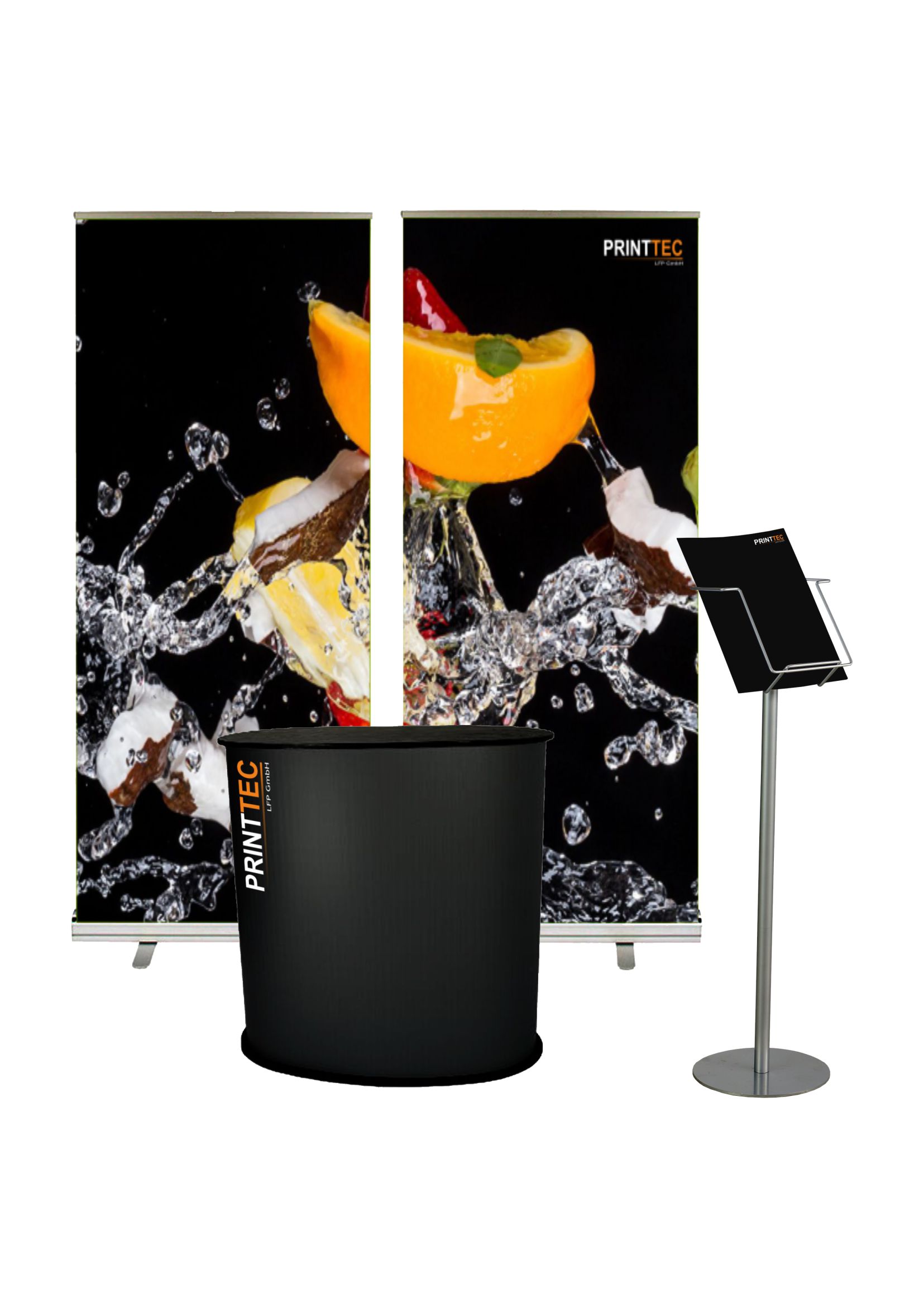 Exhibition stand PM 2 consisting of a measuring counter, 2 rollup 85 x 200 cm and a brochure holder